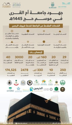 أوضح رئيس جامعة أمِّ القُرى أ. د. معدي بن محمد آل مذهب أن الجامعة تبذل سنويًّا الكثير من الجهود الحثيثة لخدمة حجاج بيت الله الحرام والمعتمرين؛ مُسخِّرة بذلك طاقاتها: البشريَّة، والعلميَّة، والبحثيَّة، والإداريَّة؛ وغيرها لتوفير أفضل الخدمات؛ وذلك انطلاقًا من اهتمام المملكة العربيَّة السُّعوديَّة والقيادة الرشيدة بتطوير وتحسين تجربة ضيوف الرحمن، وتقديم أفضل الخدمات لهم.