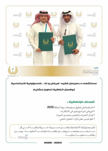 في إطار المساهمة لتحقيق مستهدفات المملكة 2030 ، تم توقيع اتفاقية تعاون مشترك بين مستشفى د. سليمان فقيه ــ الرياض و لنا..للمسؤولية الاجتماعية ، تهدف لإطلاق عدة برامج نوعية في المسؤولية الاجتماعية داخلية وخارجية ؛ تتكامل ومسيرة الشراكة الوطنية التي تقدمها مستشفيات د. سليمان فقيه كونها رافداً صحياً واقتصادياً ونموذجاً في خدمة الوطن.