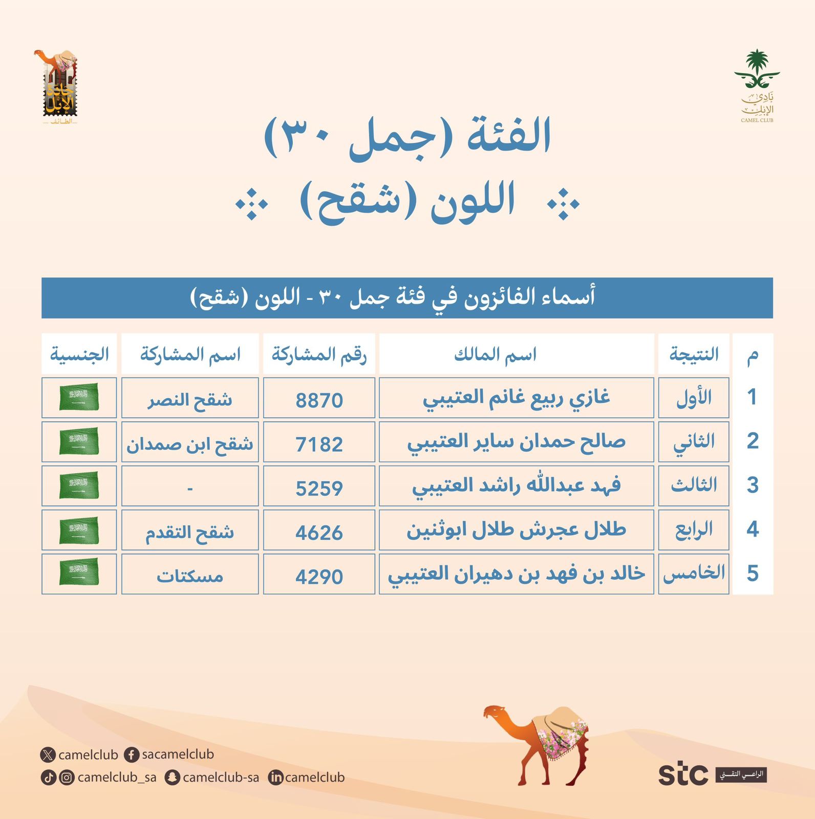 وثق مقطع فيديو لحظة إعلان فوز “شقح النصر” لمالكها غازي بن ربيع الذيابي بالمركز الأول في فئة “جمل 30 – شقح” في ‎جادة الإبل بالطائف.