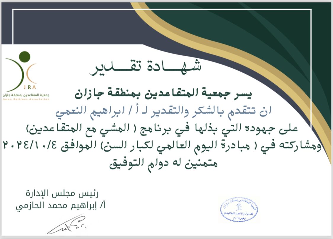 كما كرمت جمعية المتقاعدين الإعلامي الزميل “إبراهيم النعمي” نظير جهوده المبذولة في برنامج “المشي مع المتقاعدين” ومشاركتهم في مبادرة اليوم العالمي لكبار السن.