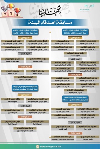 أعلنت الإدارة العامة للتعليم في الطائف نتائج مسابقة أصدقاء البيئة والتي تهدف الى اكساب الطلبة المفاهيم والمعارف المرتبطة بعلوم البيئة وغرس القيم والمبادئ السلوكية الصحيحة تجاه البيئة بما يحقق الاستدامة للبيئة تماشياً مع رؤية المملكة 2030م