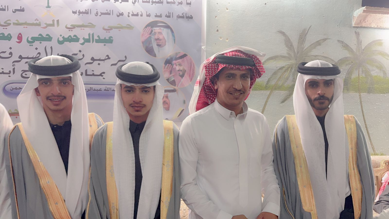 احتفل مساء اليوم الاثنين 9 / 5 / 1446 هـ رجل الأعمال “حجي حيي العويمري” بزواج أحفاده ” عبدالله ومحمد ونواف” وذلك بقصر أبو سهيلات بمحافظة الحائط.