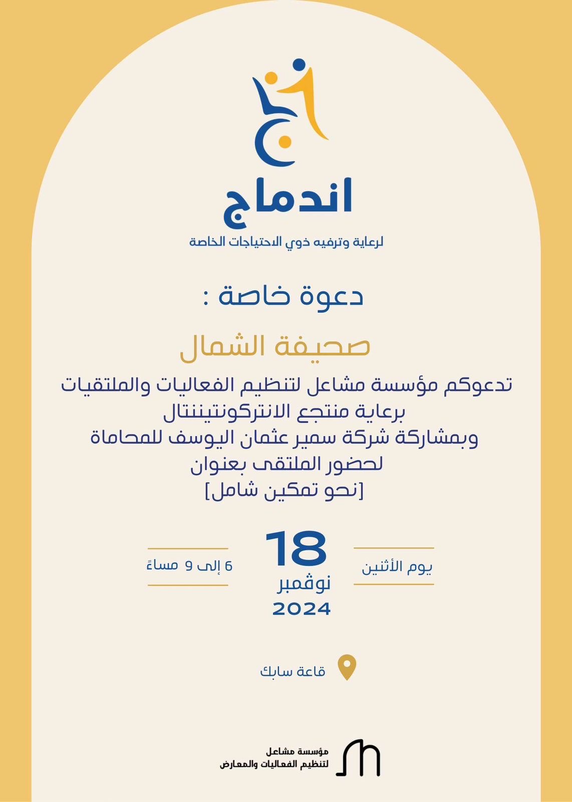 توجهت صحيفة الشمال بالشكر لمؤسسة مشاعل ولكل القائمين على تنظيم هذا الملتقى، مشيدةً بالجهود المبذولة في دعم فئة ذوي الاحتياجات الخاصة وتعزيز مكانتهم في المجتمع.