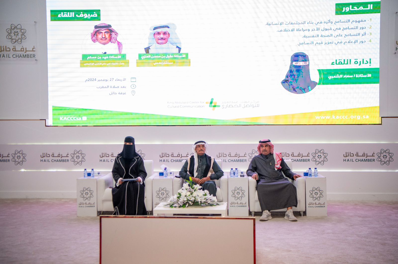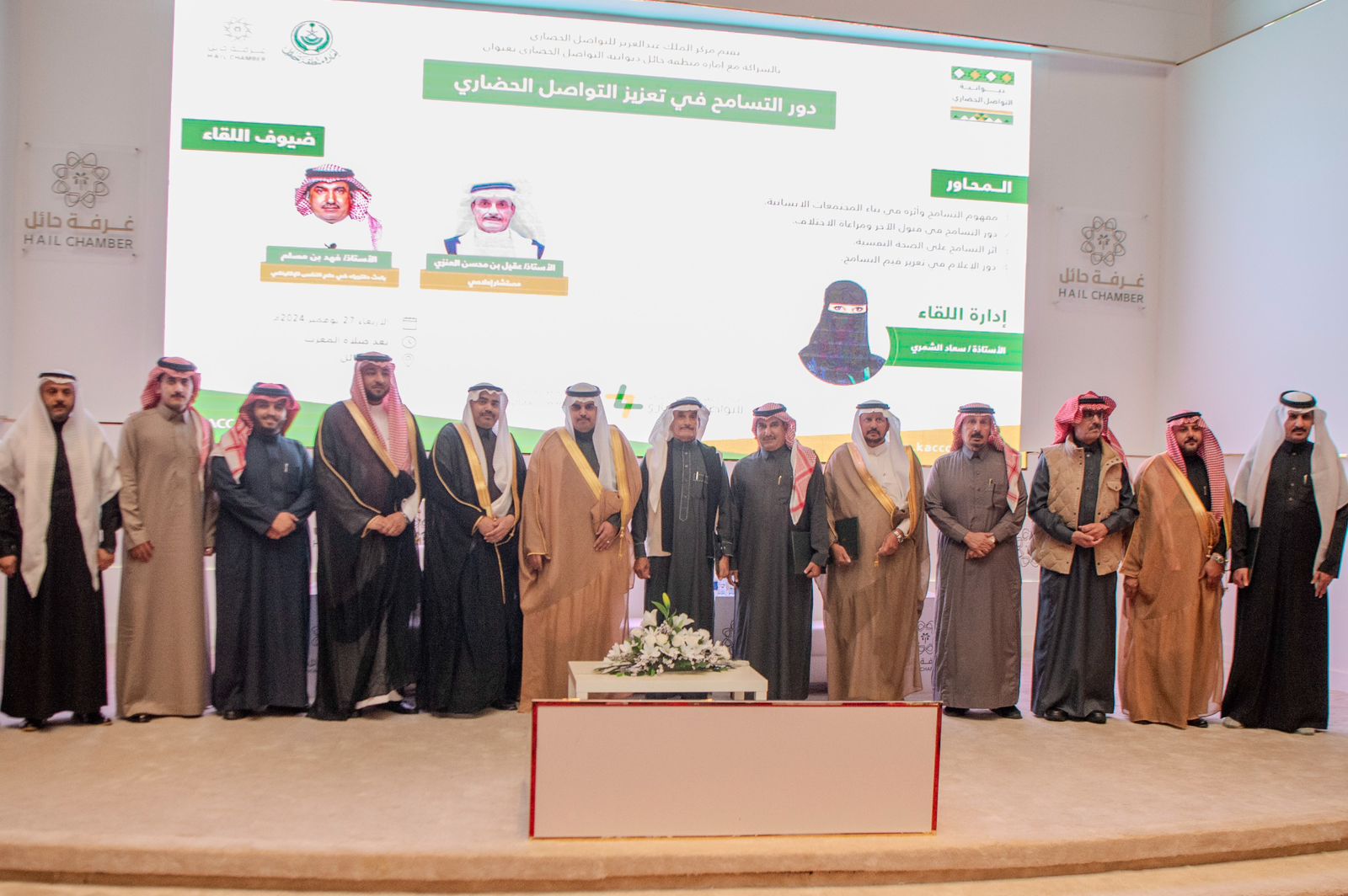 نظّم مركز الملك عبدالعزيز للتواصل الحضاري، بالشراكة مع إمارة منطقة حائل تفعيلًا للشراكة الموقعة برعاية سمو أمير منطقة حائل، مساء اليوم، ديوانية التواصل الحضاري بعنوان “دور التسامح في تعزيز التواصل الحضاري”، بحضور وكيل إمارة منطقة حائل للشؤون التنموية المكلف المهندس عماد الصبحي ومشرف مركز الملك عبدالعزيز للتواصل الحضاري بالمنطقة الدكتور جمال الرويضي، وذلك في مقر غرفة حائل.