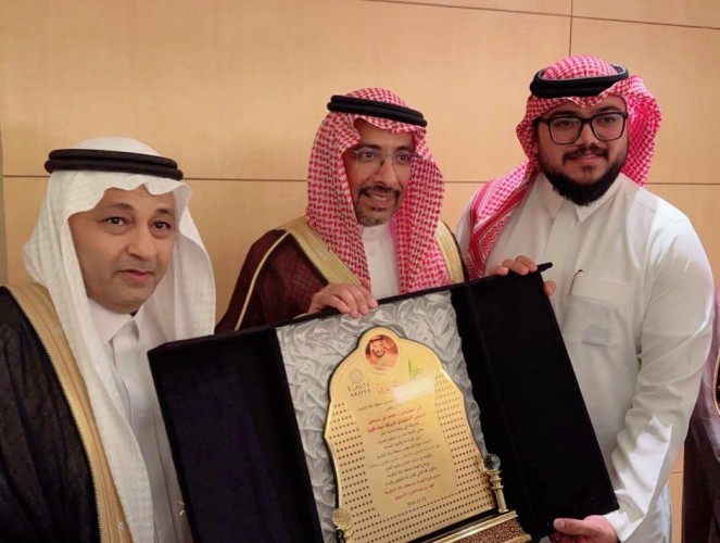 كرم وزير الصناعة والثروة المعدنية الأستاذ بندر بن إبراهيم الخريف المهندس حامد سرحان الرئيس التنفيذي لشركة مياه أكويا بدرع تذكاري .