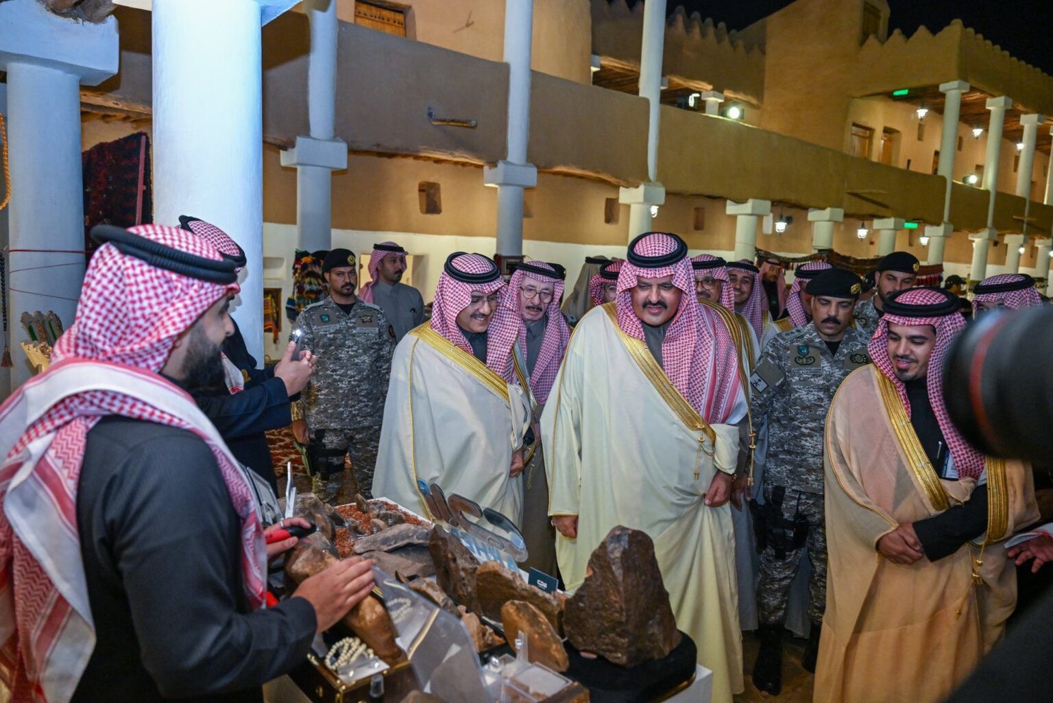 وتجول سموه فور وصوله في أجنحة محافظات المنطقة والجهات المشاركة وركن السيارات القديمة وأركان الحرف اليدوية التي تضم في جنباتها 130 حرفيًا وحرفية من مدينة حائل ومختلف محافظات المنطقة، في أضخم تجمع للحرفيين تشهده المنطقة واطلع على محتوياتها.