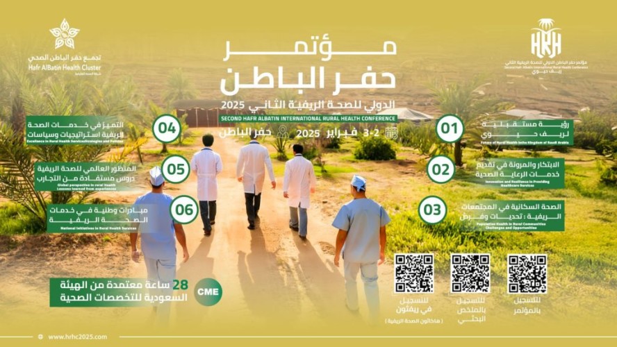 يُنظّم تجمع حفر الباطن الصحي يومي 2 – 3 فبراير 2025 م, مؤتمر حفر الباطن الدولي للصحة الريفية في نسخته الثانية تحت شعار “ريف حيوي”, بمشاركة العديد من الجهات المحلية والدولية.