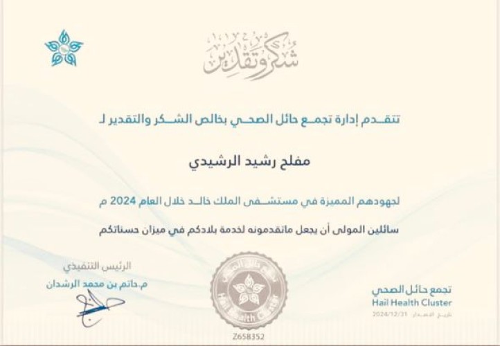 كرمت إدارة تجمع حائل الصحي الأستاذ “مفلح رشيد الرشيدي” بشهادة شكر وتقدير.