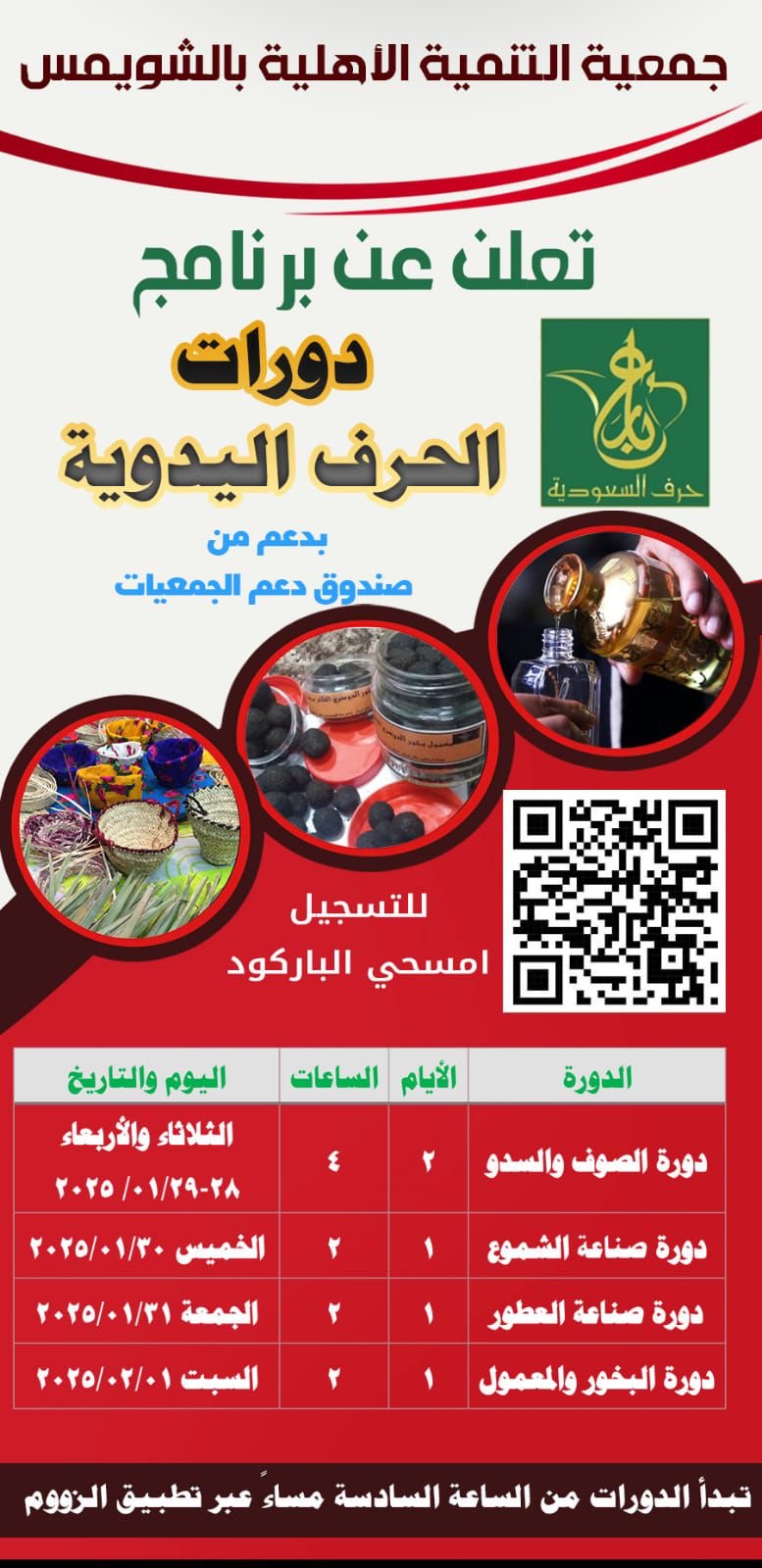 في خطوة تهدف إلى تعزيز المهارات الحرفية لدى المجتمع، أعلنت جمعية التنمية الأهلية بالشويمس عن إطلاق برنامج دورات الحرف اليدوية، بدعم من صندوق دعم الجمعيات. يتضمن البرنامج أربع دورات تدريبية مميزة، تشمل دورة الصوف والسدو، دورة صناعة الشموع، دورة صناعة العطور، ودورة صناعة البخور والمعمول.