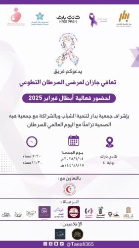 تزامناً مع اليوم العالمي للسرطان، يشهد مجمع كادي بارك بوابة ٤ بمدينة جيزان يوم الجمعة ١٤ فبراير ٢٠٢٥ م فعالية مميزة تحت عنوان “أبطال فبراير 2025″، بتنظيم من “تعافي جازان لمرضى السرطان التطوعي” وبإشراف من جمعية بدار لتنمية الشباب، وبالشراكة مع جمعية هبة الصحية و تجمع جازان الصحي بالمنطقة.