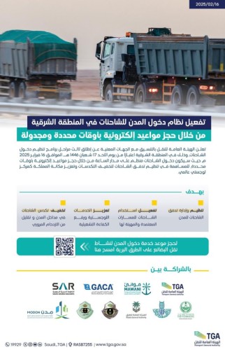 وأشارت الهيئة إلى أن دخول الشاحنات للمنطقة الشرقية خلال أوقات المنع سيكون من خلال حجز مواعيد إلكترونية وبأوقات محددة ومجدولة، عدا الشاحنات المستثناة من الجهات المعنية والمصرح لها بالدخول خلال أوقات المنع، ويأتي ذلك للإسهام في رفع كفاءة الخدمات اللوجستية، وتنظيم تدفق الشاحنات وتخفيف تكدسها على مداخل المدينة ورفع مستوى جودة وكفاءة النقل، وبما يسهم في تعزيز مكانة المملكة كمركز لوجستي عالمي.