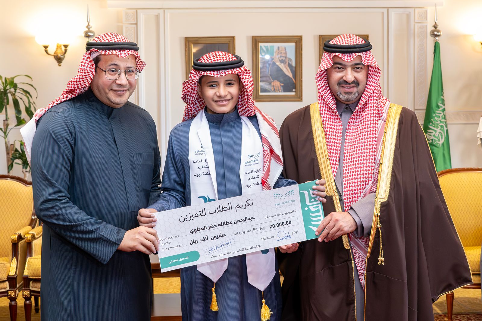 برعاية صاحب السمو الملكي الأمير فهد بن سلطان بن عبدالعزيز أمير منطقة تبوك ، كرم صاحب السمو الملكي الأمير خالد بن سعود بن عبدالله الفيصل بن عبدالعزيز نائب أمير منطقة تبوك ، اليوم بقاعة الاستقبالات الرئيسية بالإمارة ، الطلاب والطالبات الفائزين بجوائز مسابقة “منافس” الوطنية التي تنظمها وزارة التعليم للطلاب المتميزين وأولياء أمورهم، مباركاً سموه لهم هذا الإنجاز وحاثّهم على مضاعفة الجهود لتحقيق المزيد من الجوائز والنجاحات في المنافسات التعليمية المحلية والعالمية، متمنيًا لهم المزيد من التوفيق والسداد في مسيرتهم الدراسية والوصول إلى مراكز متقدمة في ظل رعاية القيادة الرشيدة – أيدهم الله – للتعليم ودعم الطلاب المتميزين والموهوبين.