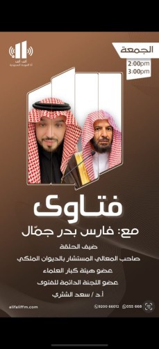 واخيرا برنامج (فتاوى) والذي يتم فيه استضافة عدد من أصحاب المعالي والفضيلة أعضاء هيئة كبار العلماء والمستشارين بالديوان الملكي وأعضاء اللجنة الدائمة للفتوى ومنهم :- معالي الشيخ الاستاذ الدكتور سعد الشتري، ومعالي الشيخ سعد بن تركي الخثلان، ومعالي الشيخ عبد الله الركبان، ومعالي الشيخ الدكتور صالح الحساوي ، وفضيلة الشيخ الدكتور رضوان الرضوان . حيث يتم في هذا البرنامج ” فتاوى” استقبال عدد من استفسارات الناس أسئلتهم بالرسائل والاتصالات الواردة عبر خدمة ( وأتس آب) الإذاعة سواء حول أحكام وامور الصيام والقيام وصلات التراويح وغيرها من الأمور المتعلقة بشؤونهم اليومية خلال شهر رمضان ، ويتم ببث الفتاوى بصورة مباشرة ولمدة ساعة يميا وتحديدا من الساعة 1 ظهرا ولغاية الساعة 2 ظهرا طيلة أيام شهر رمضان المبارك .