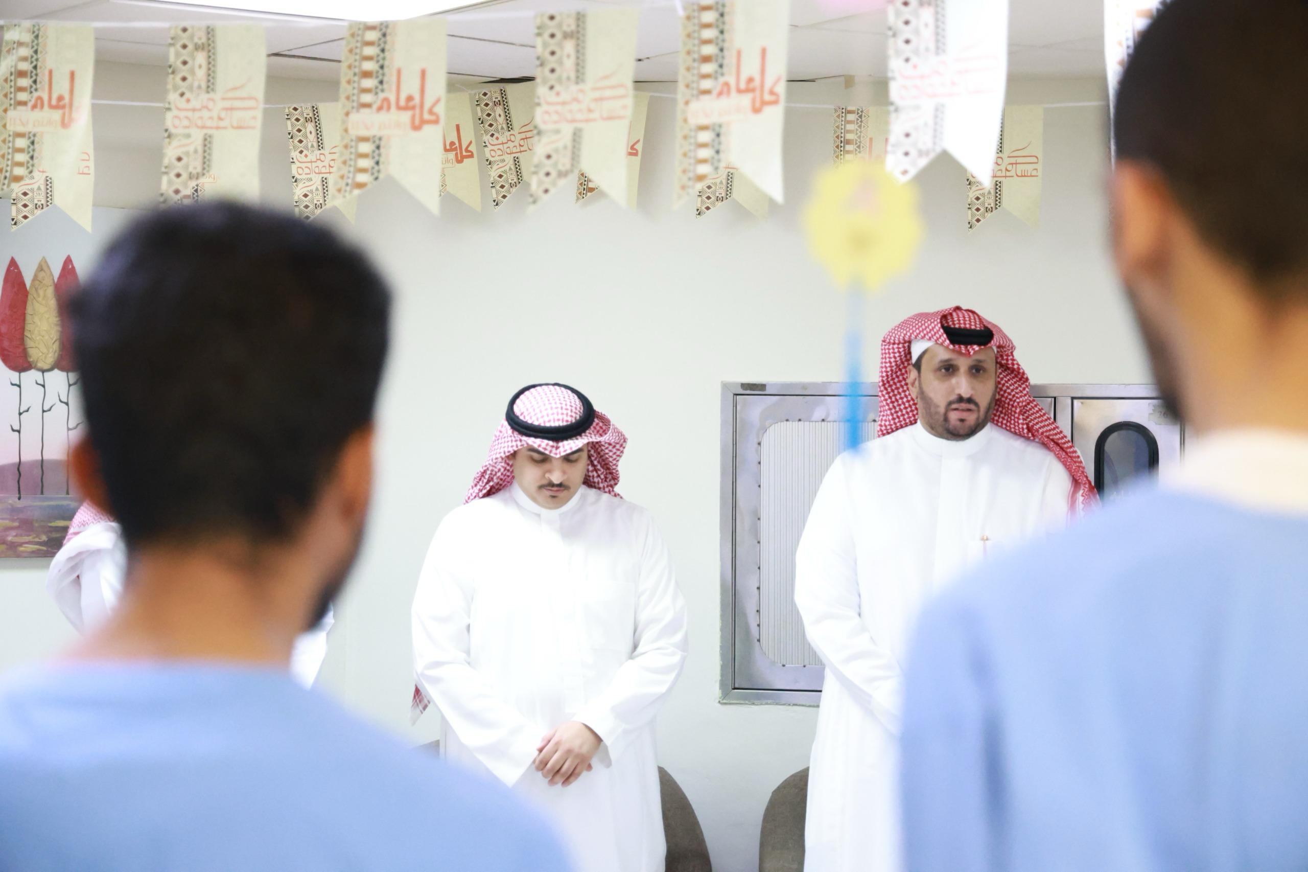 وبهذه المناسبة رفع الدكتور العصيمي التهنئة لمقام خادم الحرمين الشريفين وولي عهد الإميني حفظهما الله وللشعب السعودي الكريم بهذه المناسبة، سائلًا الله العلي القدير أن يعيده على بلادنا بالخير والبركة، وأعرب في كلمته عن شكره وتقديره لجميع الموظفين المكلفين بالعمل خلال إجازة العيد على ما يبذلونه من جهود لخدمة المرضى.