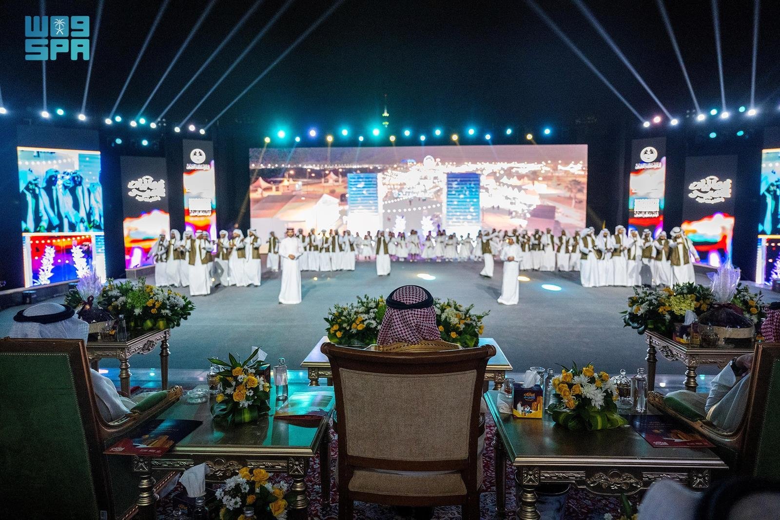 إثر ذلك قُدم أوبريت وطني بعنوان “وطن الأعياد”، عقبه عروض فلكلورية مستوحاة من تراث المنطقة، كما شارك سموه بالعرضة السعودية بهذه المناسبة السعيدة.