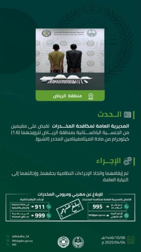 قبضت المديرية العامة لمكافحة المخدرات على مقيمَين من الجنسية الباكستانية بمنطقة الرياض لترويجهما (1.6) كيلوجرام من مادة الميثامفيتامين المخدر (الشبو)، وأوقفا واتُّخذت الإجراءات النظامية بحقهما، وأُحيلا إلى النيابة العامة.