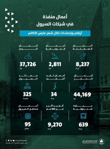 أنجزت أمانة منطقة الرياض سلسلة من الأعمال الميدانية في شبكات السيول خلال شهر مارس من عام 2025، شملت تنفيذ أعمال الردم بمجموع تجاوز سبعة وثلاثين ألف متر مكعب، إضافة إلى أكثر من ألفين وثمانمائة متر مكعب من أعمال الخرسانة، وثمانية آلاف ومائتين وسبعة وثلاثين مترًا طوليًا من أعمال السفلتة.