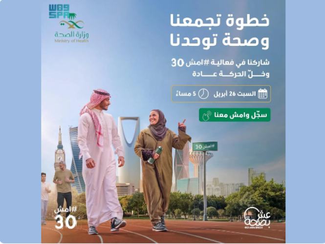 وتدعو الوزارة الراغبين بالمشاركة إلى التسجيل عبر الرابط الإلكتروني التالي: https://walking30.moh.gov.sa/pages/pathsOf30.html.