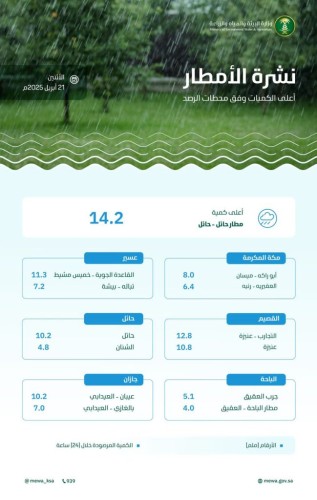 ووفقًا للتقرير اليومي الصادر عن وزارة البيئة والمياه والزراعة حول كميات هطول الأمطار في مناطق المملكة كافة؛ فقد سجّلت (43) محطة رصد هيدرولوجي ومناخي، خلال الفترة من الساعة التاسعة صباح يوم الأحد 20 أبريل وحتى التاسعة صباح يوم الاثنين 21 أبريل 2025م، هطول أمطارٍ في مناطق (مكة المكرمة، المدينة المنورة، عسير، القصيم، حائل، الرياض، الحدود الشمالية، جازان، نجران، والباحة).
