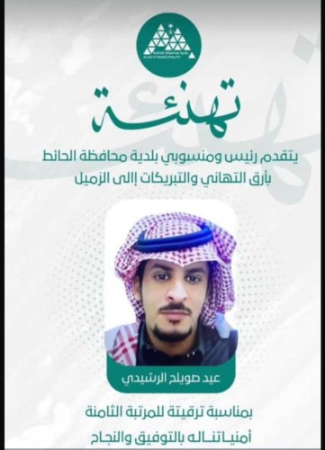 صدر قرار إداري يقضي بترقية الأستاذ “عيد صويلح الرشيدي”، أحد منسوبي بلدية محافظة الحائط، إلى المرتبة الثامنة، وذلك تقديراً لجهوده وتفانيه في أداء مهامه خلال الفترة الماضية.