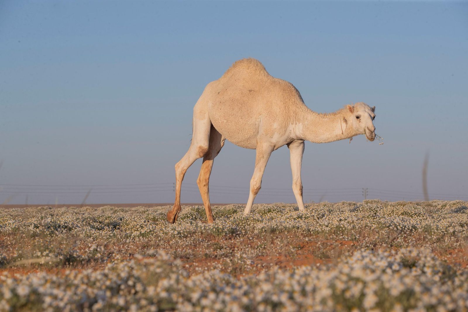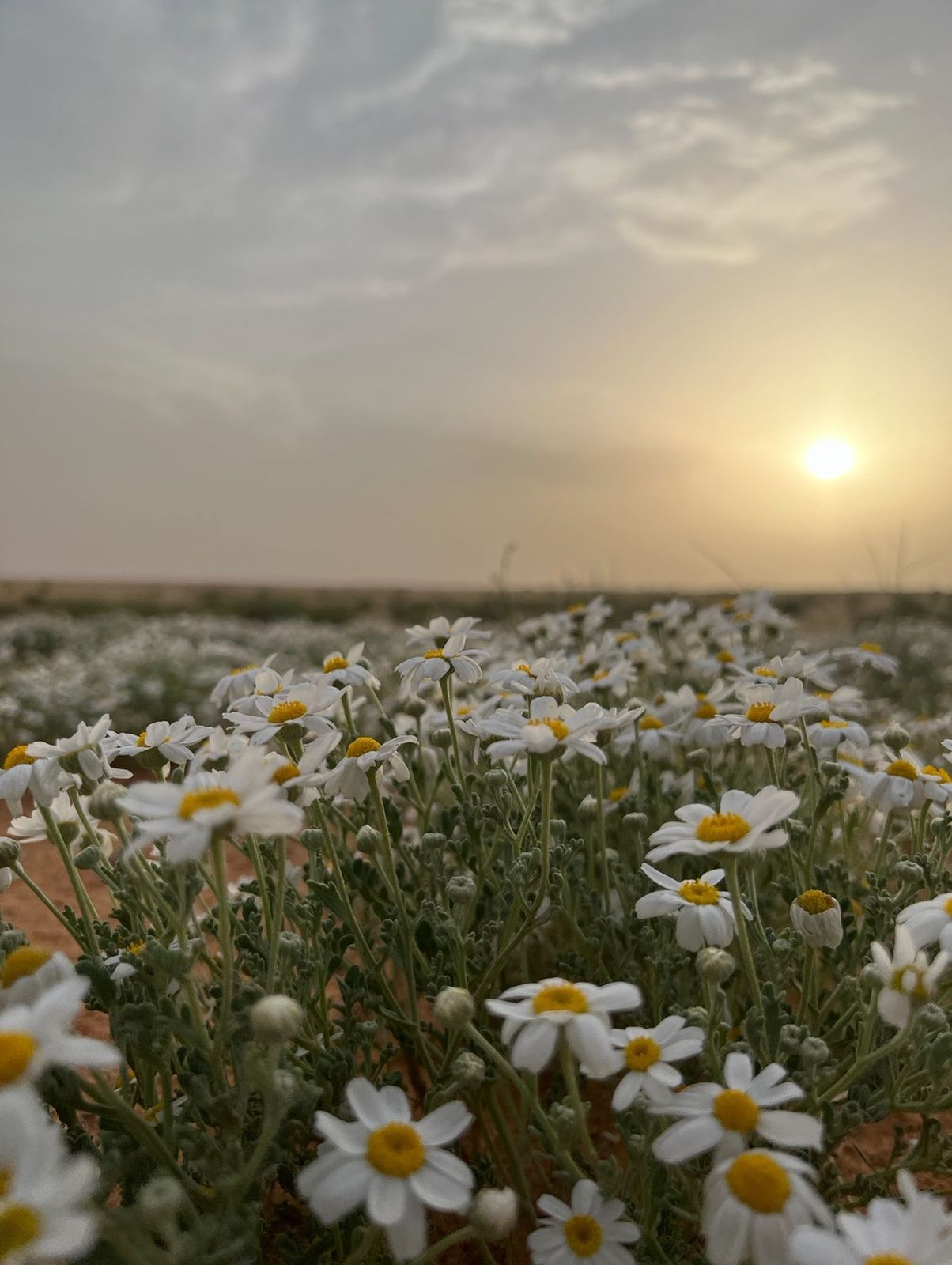 في هذا الموسم، تَظهر زهرة الأقحوان بكثافة على امتداد السهول الشمالية، منبسطةً كأنها سجادة من نور، مرسومة بخيوطٍ من بياضٍ نقي وأصفر دافئ، تعانق خُطى الإبل في مشهدٍ يجمع ما بين الطُهر والعراقة، وما بين سكينة الطبيعة وفروسية المكان.