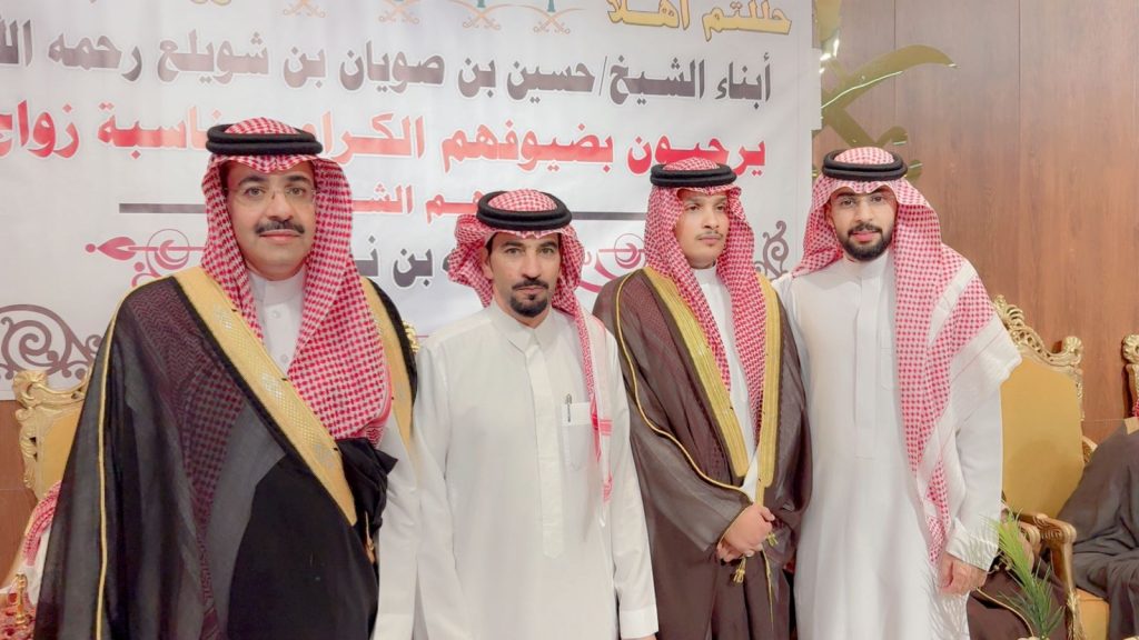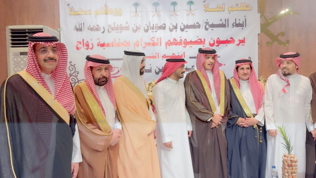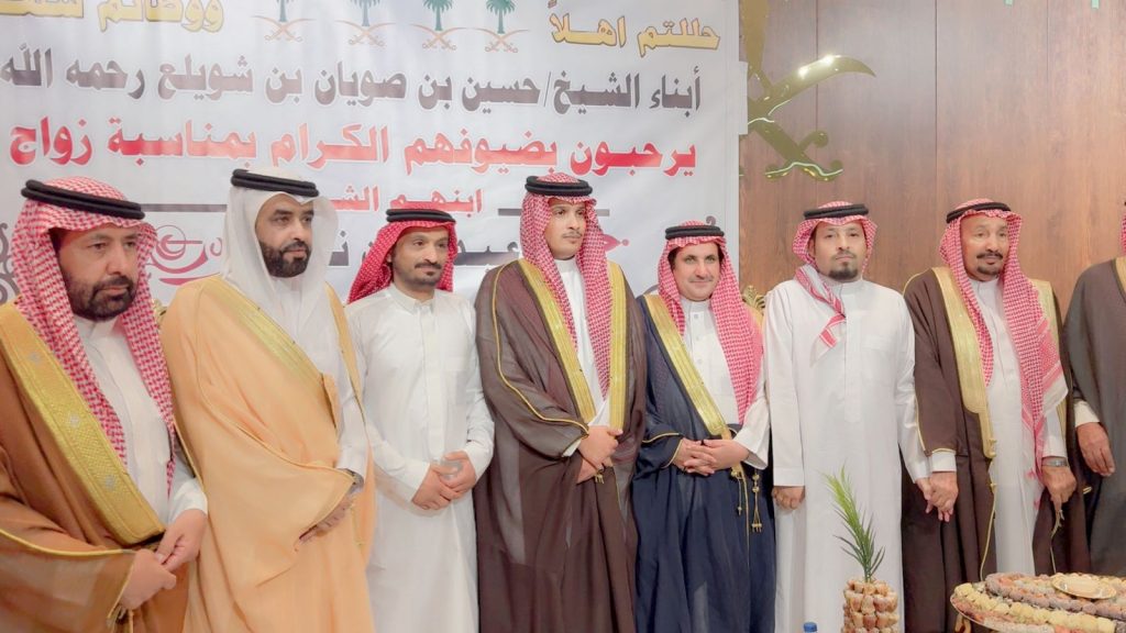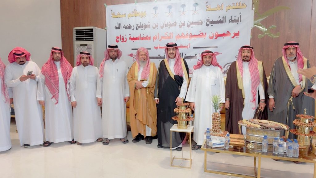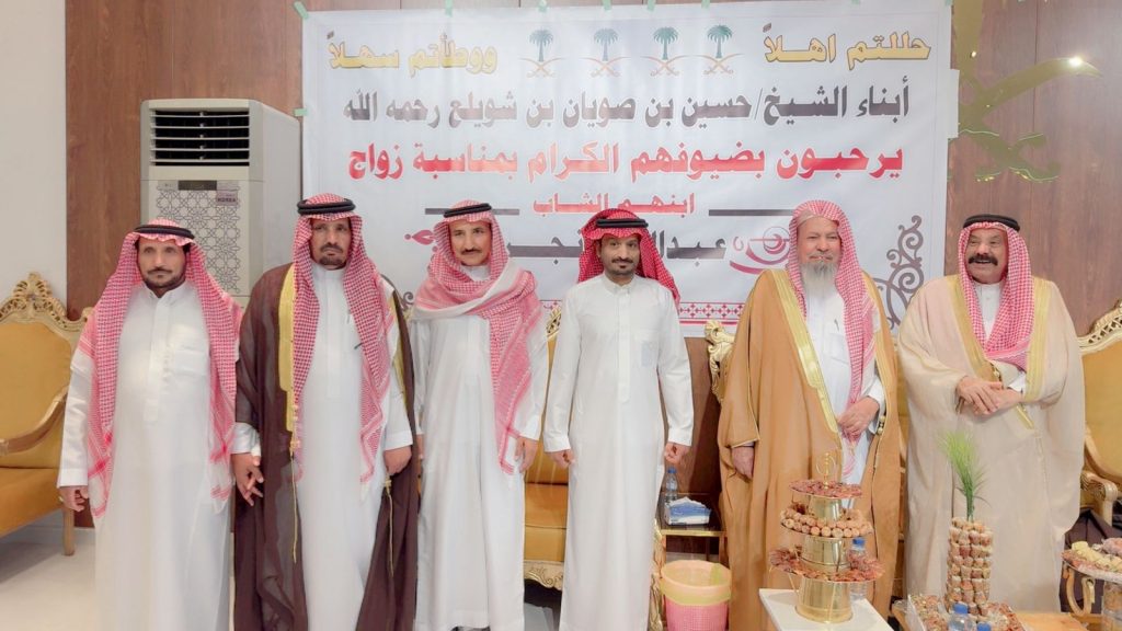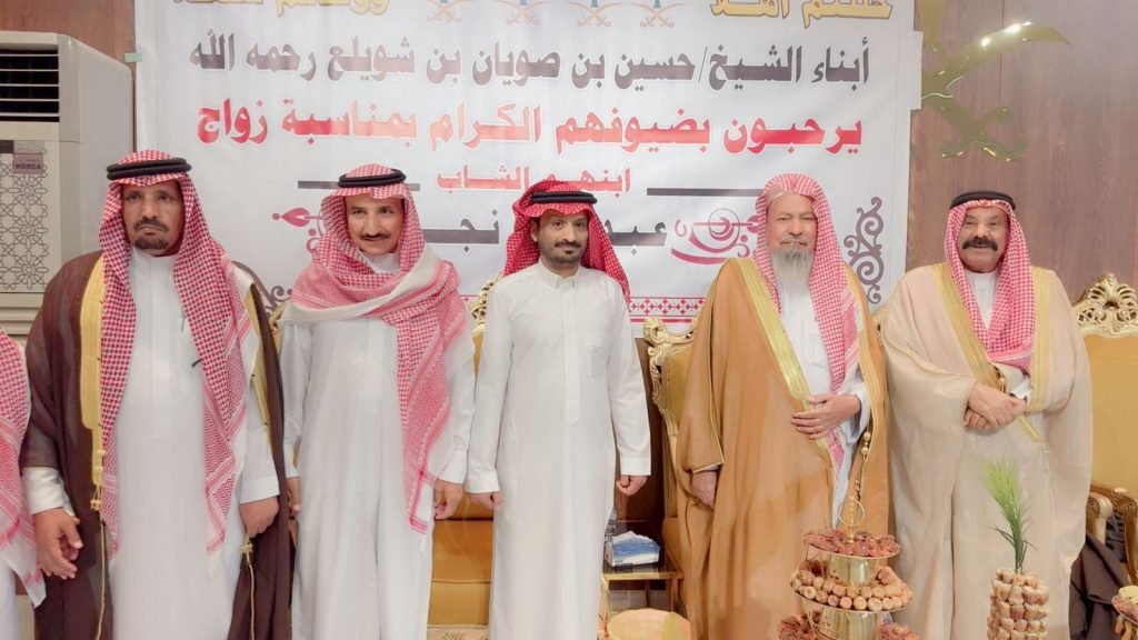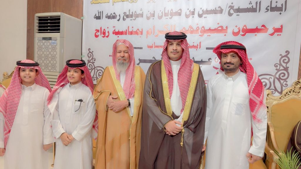 احتفل مساء اليوم الخميس أبناء المرحوم الشيخ “حسين صويان بن شويلع” بزفاف ابنهم الشاب “عبدالله نجر” على كريمة رجل الأعمال “خالد موسى الشويلعي”.