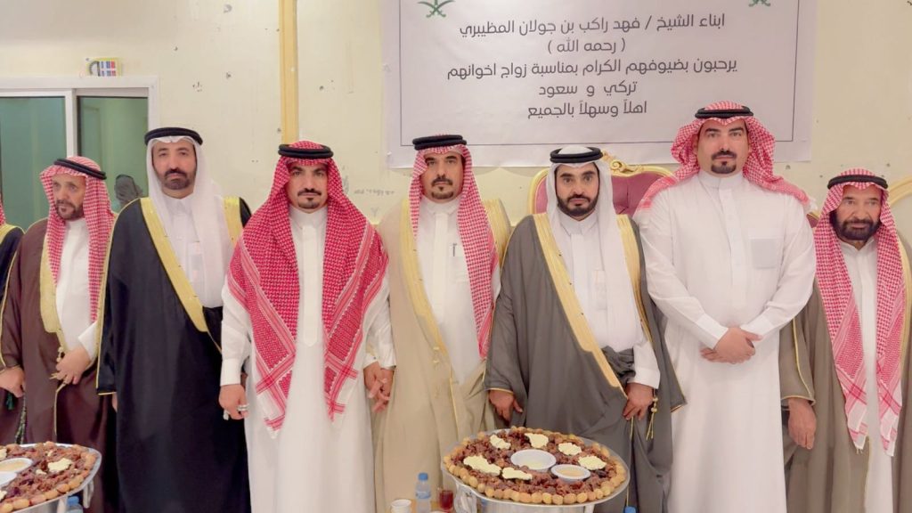 احتفل أبناء المرحوم فهد بن راكب بن جولان المظيبري مساء يوم الجمعة الموافق 7 صفر 1447هـ، بزواج إخوانهم، وذلك في قصر الفقي للاحتفالات جنوب غرب مدينة حائل، وسط حضور كبير من الوجهاء والمسؤولين وأعيان القبائل والأهالي.