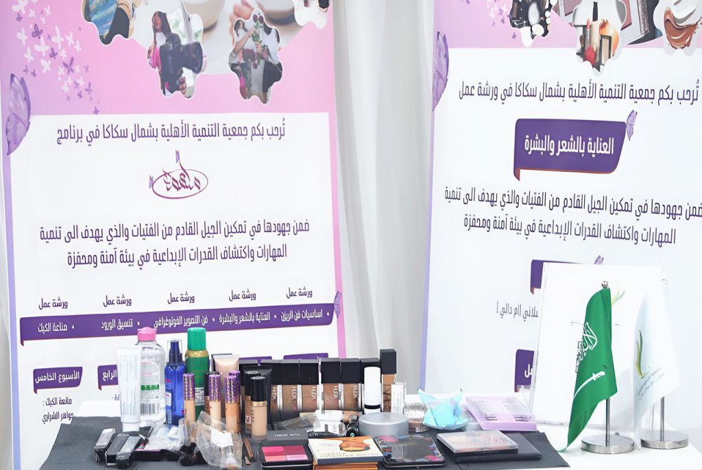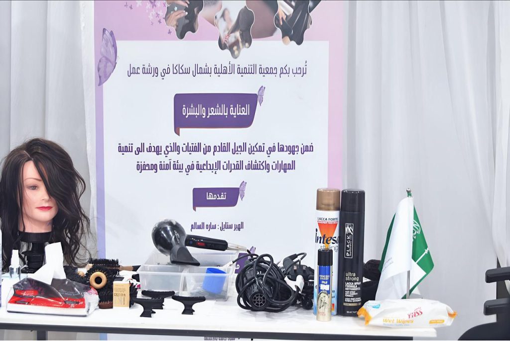 نظمت جمعية التنمية الأهلية بشمال سكاكا، بالتعاون مع جمعية الملك عبد العزيز النسائية للتنمية الاجتماعية، ورشة تدريبية متخصصة للعناية بالبشرة والشعر، استهدفت تعزيز مهارات 35 متدربة في مجالات التجميل وتصفيف الشعر. أشرفت على هذه الفعالية كل من خبيرة المكياج العنود الرسلاني، وخبيرة تصفيف الشعر سارة السالم.