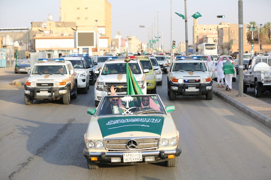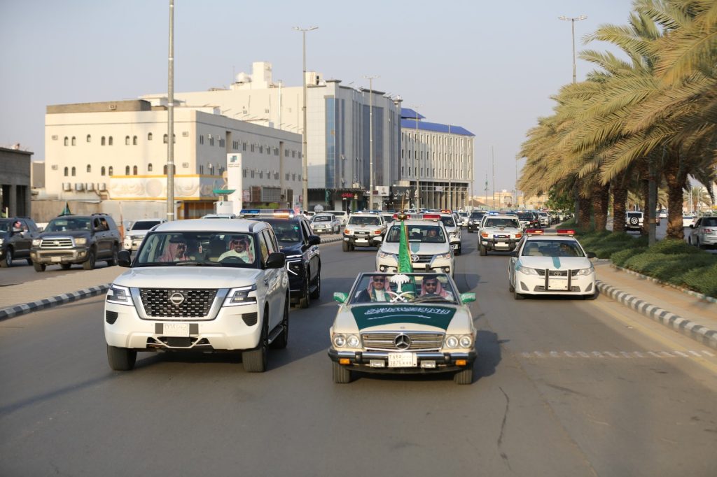 واصطف الأهالي والمقيمون على جانبي الطريق رافعين الأعلام الوطنية ومعبّرين عن مشاعر الفرح والاعتزاز بهذه المناسبة الغالية، ومؤكدين ولاءهم ووفاءهم للوطن وقيادته الرشيدة.