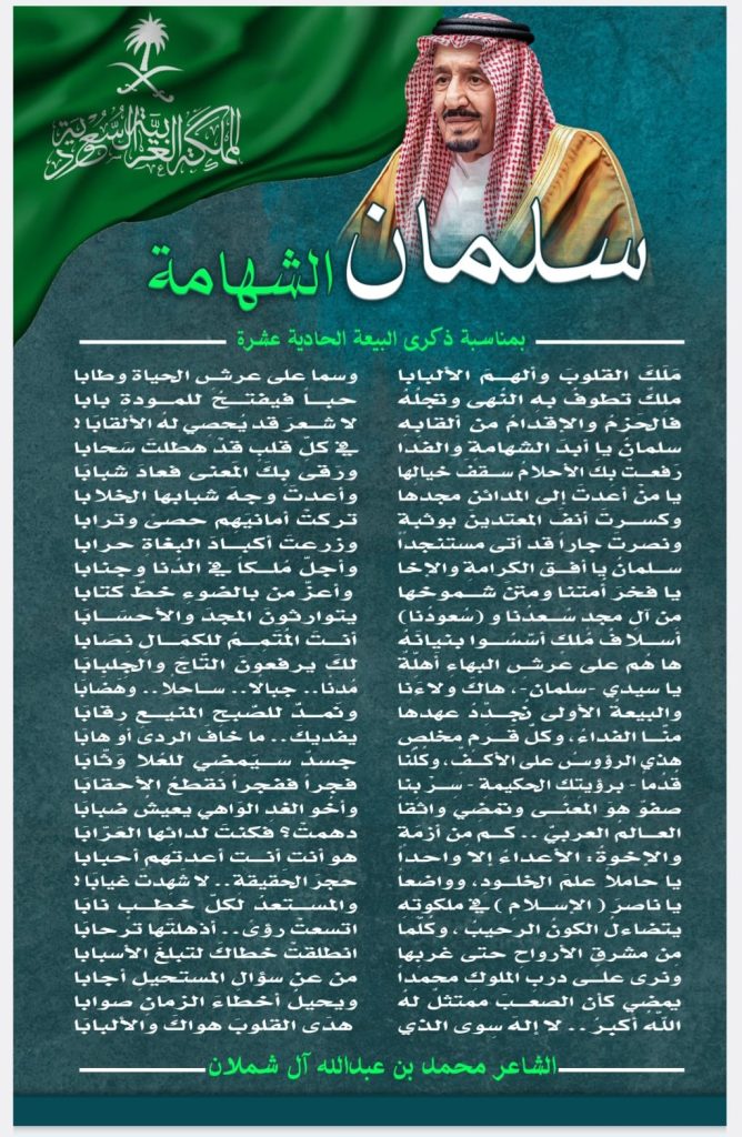 «آل شملان» يوثق مشاعر الولاء في ذكرى البيعة الـ11: قصيدة وفاء للملك والوطن