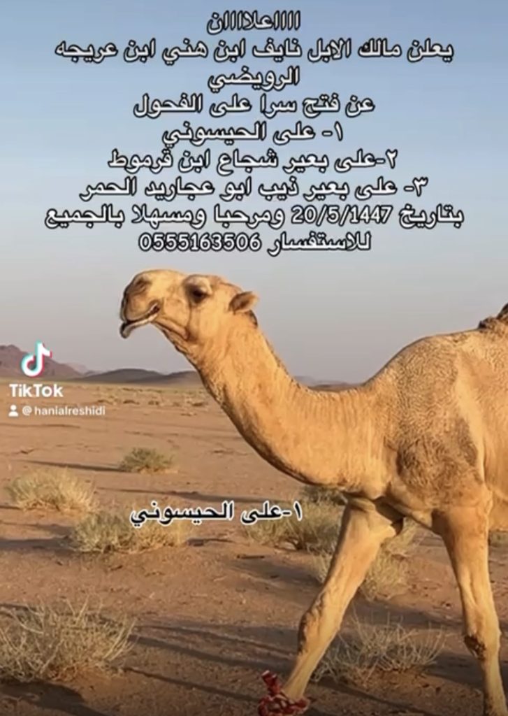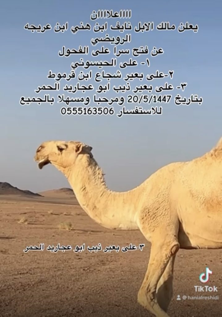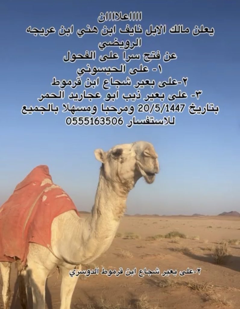 في ساحة الفخر والموروث العربي الأصيل، أعلن مالك الإبل المعروف نايف ابن هني عربجه الرويضي عن فتح السّرى على ثلاثة من نخبة فحول الإبل ذات السلالات المتميزة، ابتداءً من تاريخ 20/ 5/ 1447 هـ، مرحّبًا بجميع المهتمين وعشاق الأصايل من مختلف أنحاء المملكة.