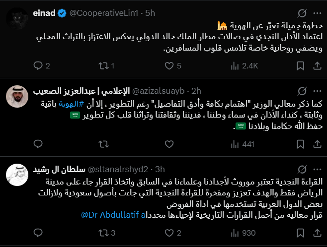وتفاعل نشطاء منصة “إكس” مع تلك الخطوة، وجاءت أبرز التعليقات:” خطوة جميلة تعبّر عن الهوية اعتماد الأذان النجدي في صالات مطار الملك خالد الدولي يعكس الاعتزاز بالتراث المحلي ويضفي روحانية خاصة تلامس قلوب المسافرين”.