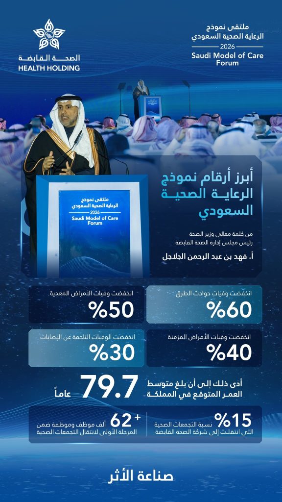 كشف معالي وزير الصحة ورئيس مجلس إدارة شركة “الصحة القابضة”، الأستاذ فهد بن عبدالرحمن الجلاجل، خلال كلمته  في “ملتقى نموذج الرعاية الصحية السعودي 2026″، عن نتائج وإنجازات تاريخية حققها التحول الصحي في المملكة .