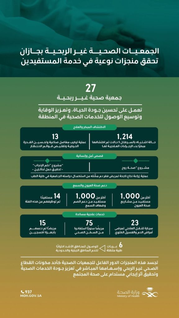 عبر 27 جمعية صحية.. فحص 1214 حالة اشتباه بالسرطان وتنفيذ 13 عملية مفاصل صناعية في جازان