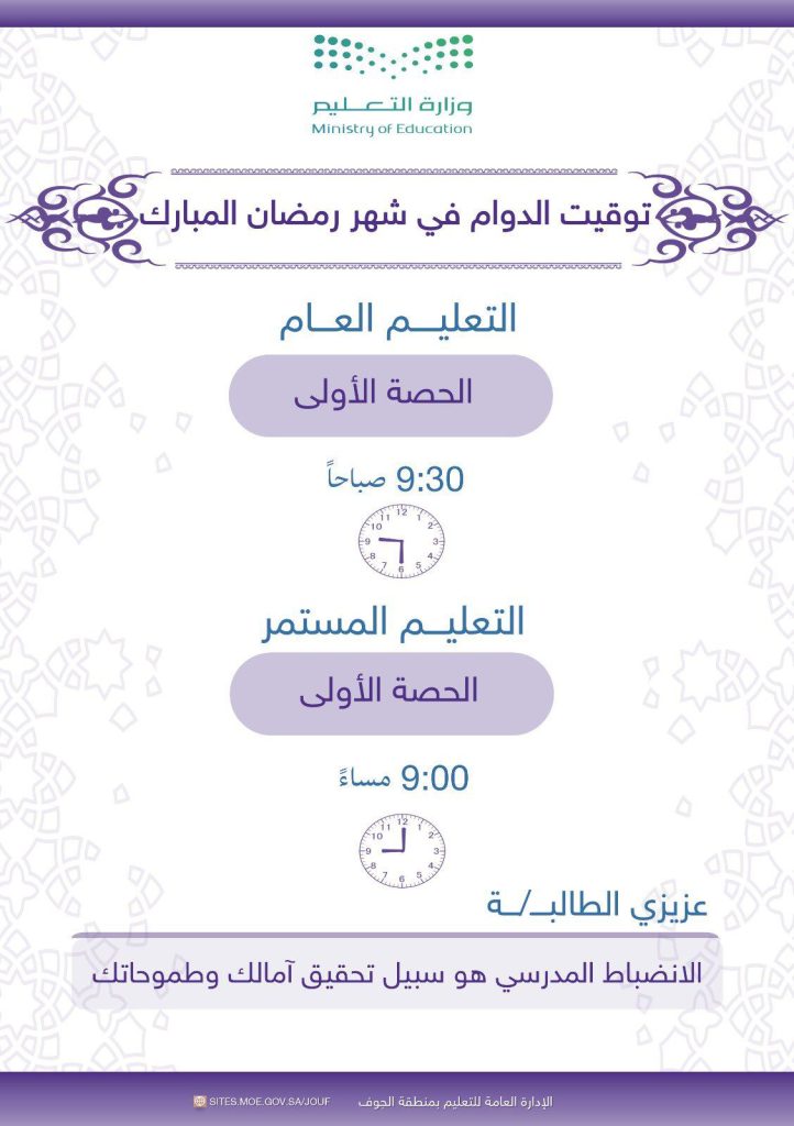 اعتمدت الإدارة العامة للتعليم بمنطقة الجوف، مواعيد الدوام مع بداية دخول شهر رمضان المبارك، لجميع المدارس الحكومية والأهلية والأجنبية ورياض الأطفال بالمنطقة، إذ يبدأ الحضور عند الساعة 9:30 صباحاً لمدارس التعليم العام، والساعة 9 مساءً لمدارس التعليم المستمر.
