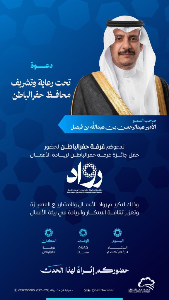 حفرالباطن – شهدت محافظة حفرالباطن إقامة حفل جائزة غرفة حفرالباطن لريادة الأعمال، بحضور ورعاية سمو محافظ حفرالباطن، صاحب السمو الأمير عبد الرحمن بن عبد الله بن فيصل، في فعالية جسدت الاهتمام المتزايد بدعم رواد الأعمال وتحفيز بيئة الابتكار في المحافظة.
