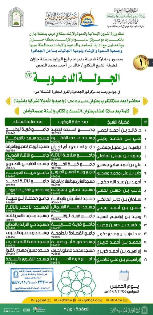 نفذ فرع وزارة الشؤون الإسلامية والدعوة والإرشاد بمنطقة جازان، بالتعاون مع مراكز الدعوة والإرشاد بجازان ومحافظة صبيا ومركز قوز  الجعافرة، الجولة الدعوية رقم 13، التي شملت جوامع ومساجد قرى مركز قوز الجعافرة.