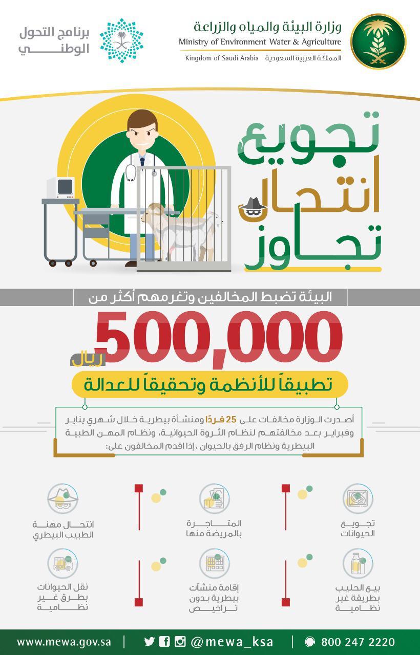 صبطت وزارة البيئة والمياه والزراعة 25 فرد ومنشأة بيطرية خالفوا أنظمة الثروة الحيوانية والمهن الطبية البيطرية والرفق بالحيوان، وغرّمتهم بـ 565 ألف ريال خلال شهري يناير وفبراير الماضيين.