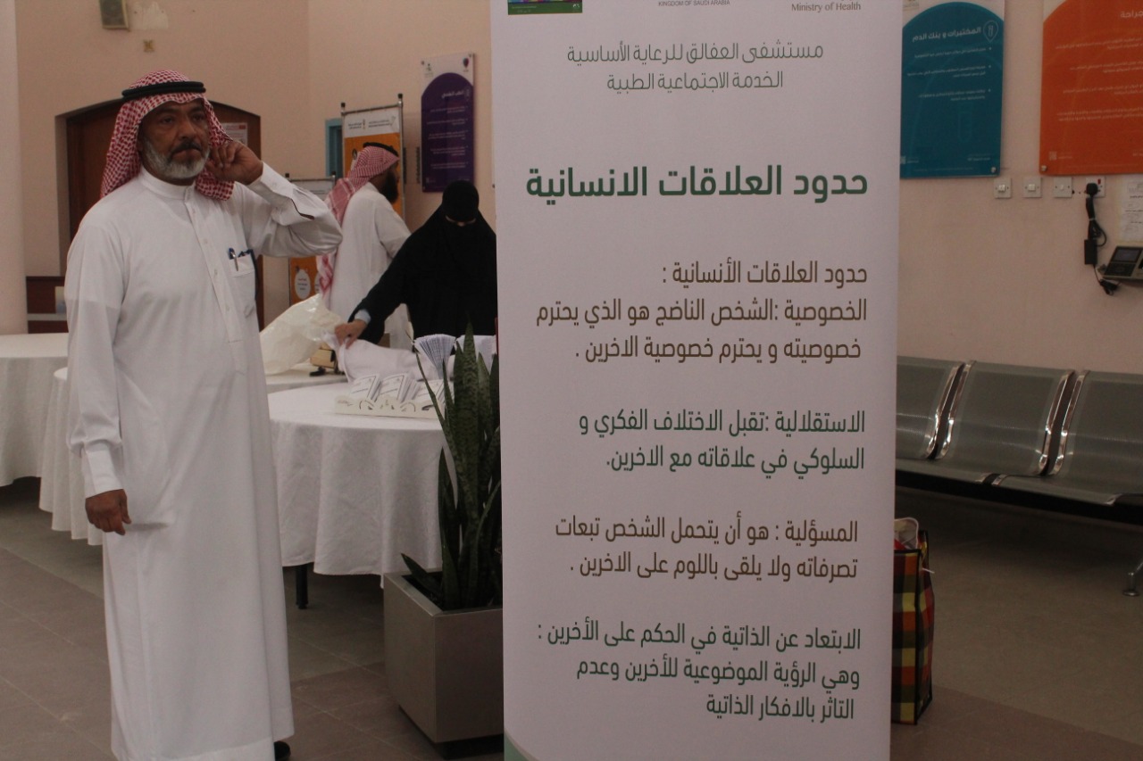 في صباح يوم الثلاثاء 19-7-1440نظم قسم الخدمة الاجتماعيةالطبية بمستشفى الشيخ حسن العفالق للرعاية الأساسية فعالية يوم الخدمة الاجتماعية برعاية مدير المستشفى صلاح بن ابراهيم الفوزان وحضور كل من سعادة مساعد مساعد مدير الشئون الصحية للخدمات العلاجية ومدير ادارة الصحة النفسية والاجتماعية بالمديرية وبقيادة الاخصائي الاجتماعي الاستاذ عايد الدوسري بعنوان ( العلاقات الأنسانية) وتضمنت الأركان العلاقات الانسانية بجميع جوانبها من ناحية تعريفية بمضمون العلاقات الانسانية واهميتها وأهدافها واثر هذه العلاقات على الانسان ومسيرة حياته الشخصية بمستوياتها المختلفة و نشأة هذه العلاقات في الاسرة والمدرسة والمجتمع والعمل وايضا أوضحت اهميتها لشخص المريض بأزالة المخاوف والعزلة والشعور الذي ينتابه بالعجز وعدم التقبل فالعلاقات الانسانية وترابطها واستمرارها يعطي المريض قوة في مقاومة المرض والالتزام بخطة العلاج والتكيف في البيئة بما يتناسب مع وضعه الصحي وشارك في تفعيل الأركان مجموعة من طالبات جامعة الملك فيصل بكلية الآداب قسم علم الاجتماع والخدمة الاجتماعية *ومتطوعات من فريق همسات الثقافي بالاحساء بقيادة الاستاذ هلال العيسى بركن الخدمة الاجتماعية وعرض لوحات ورسومات والرسم المباشر* وايضا بعض المتطوعات من خريجات الخدمة الاجتماعية وشارك بعض اقسام المستشفى في الفعالية بأركان كقسم التمريض و التغذيةوالاتصال الداخلي والتثقيف الصحي وقد حضر الفعالية الاستاذ عادل السويعي رئيس قسم الخدمة الاجتماعية بمستشفى الصحة النفسية وموظفين المستشفى بمختلف الأقسام واساتذة من جامعة الملك فيصل وطالبات مدرسة الثانوية الثانية بالهفوف وقد نالت الفعالية على إعجاب الحضور وأنها حققت الهدف الذي تمت من اجله بايصال مفهوم العلاقات الانسانية وكيفية تكوينها في مختلف المجالات ومثل فريق *همسات* سوسن البن احمد وليلى القويضي وتراتيل الفرح وامينه السليمان وريم محمد العيسى وزينب بوحسن وهواشم المقهوي وثريا الرشيد ووداد وساجدة الخميس وبدريه الحويل علياء بن عمر ودلال الطريفي هاجر السيف واسيه المطيع وشهد الياسين و الختام فقد شكر الاخصائي الاجتماعي الأستاذ عايد الدوسري جميع المشاركين في الفعالية على جهدهم المبذول في نجاحها.