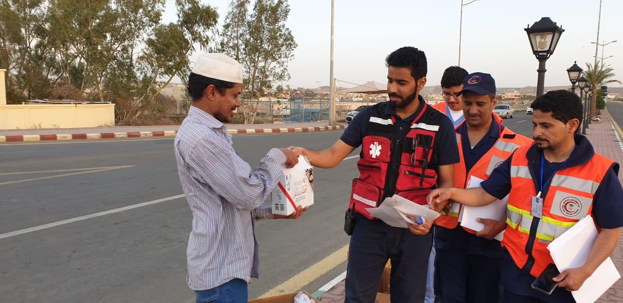 وتواجد مدير عام الفرع ومساعد المدير العام للشؤون الاسعافية والقيادات الميدانية ومدير ادارة الاتصال الموسسي والفرق الاسعافية بالميدان لحظة التوزيع
