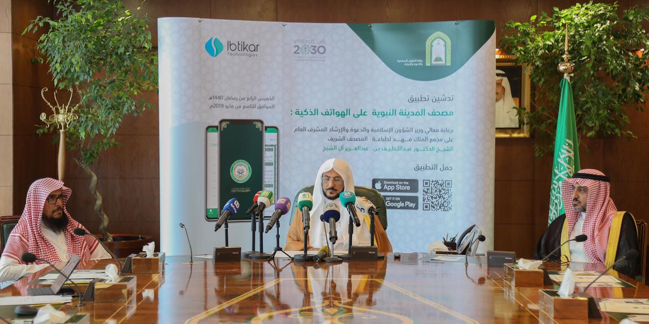 دشن معالي وزير الشؤون الإسلامية والدعوة والإرشاد المشرف العام على مجمع الملك فهد لطباعة المصحف الشريف بالمدينة المنورة الشيخ الدكتور عبداللطيف بن عبدالعزيز آل الشيخ، في مقر الوزارة بمدينة الرياض اليوم الخميس، تطبيق “مصحف المدينة النبوية” الذي يطلقه المجمع في نسخته الأولى على منصتي: (IOS، Android)، بحضور معالي نائب الوزير الدكتور يوسف بن محمد بن سعيد ووكلاء الوزارة والأمين العام للمجمع ومديري العموم بديوان الوزارة وكوكبة من الإعلاميين وممثلي الصحف والقنوات الفضائية السعودية.