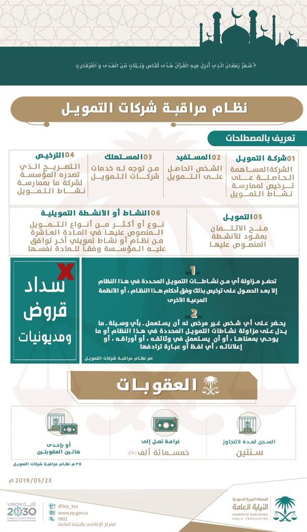 أوضحت النيابة العامة العقوبات المترتبة على ممارسة سلوكيات مخالفة لنظام مراقبة شركات التمويل، مثل نشر إعلانات عن سداد القروض والمديونيات.