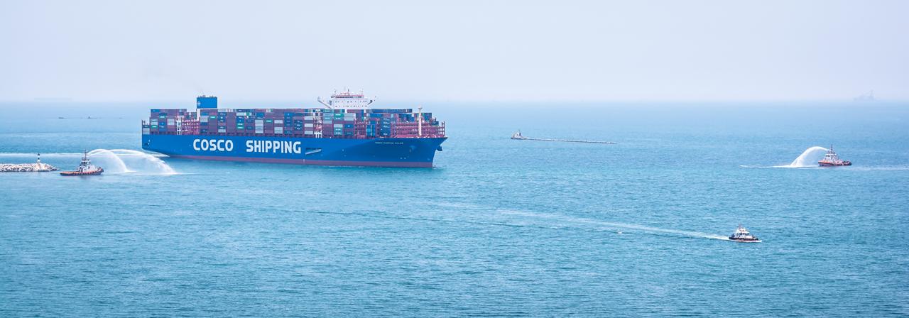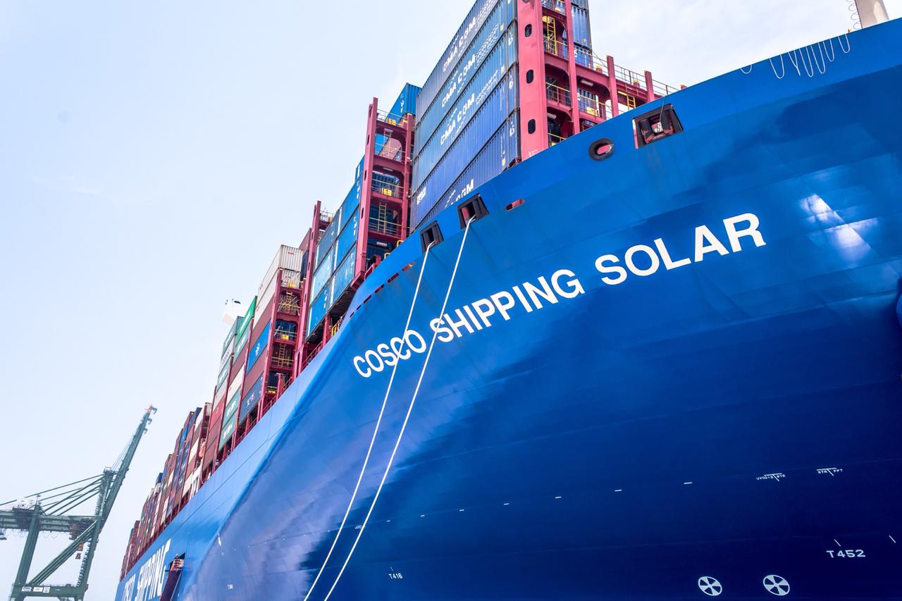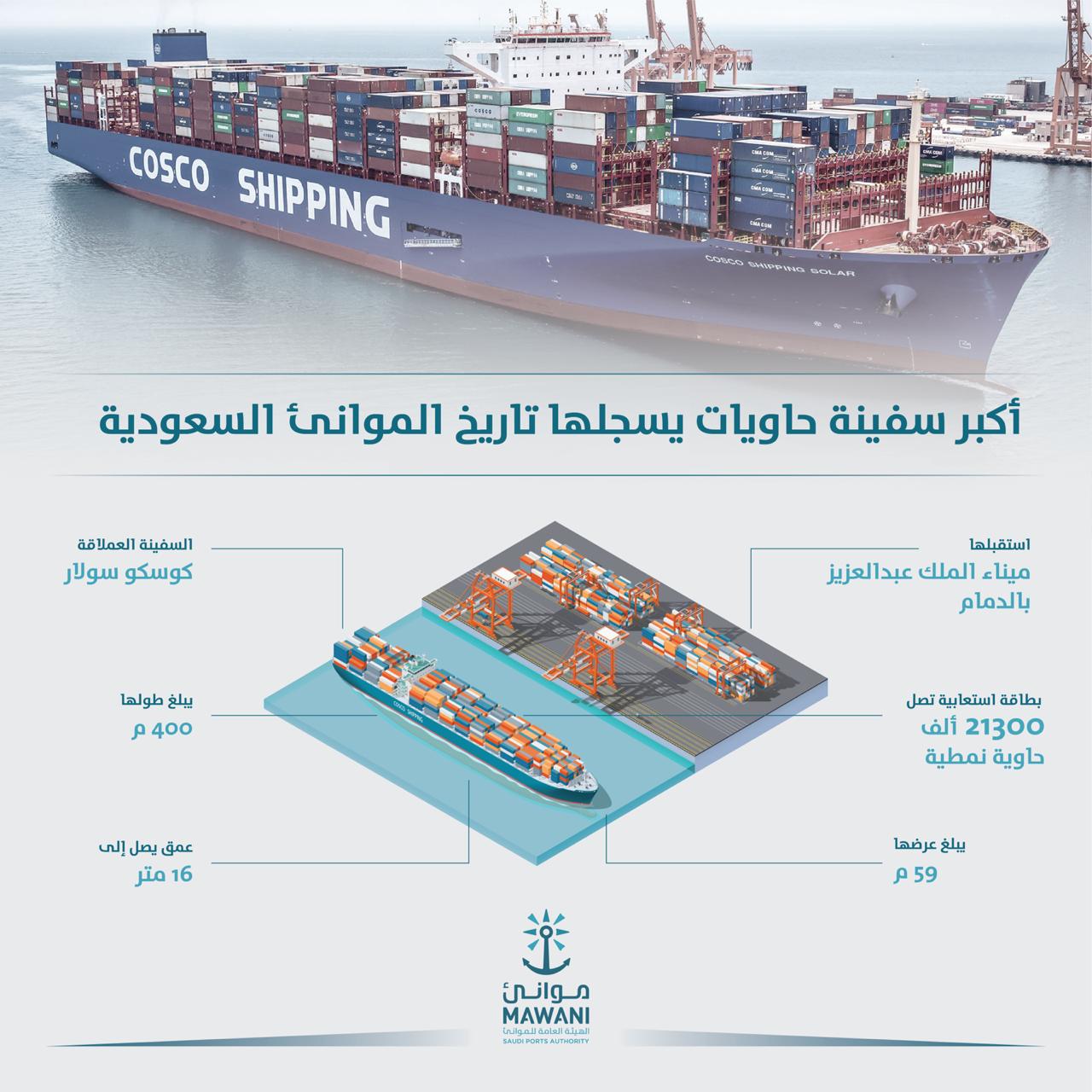 وتحمل السفينة العملاقة (كوسكو سولار) 400 متر طولاً و 59 متر عرضاً وبطاقة استيعابية تصل إلى 21300 ألف حاوية نمطية بعمق يصل إلى 16 متراً، وذلك في رحلتها الأولى منذ تدشينها بداية العام 2019، بحضور معالي رئيس الهيئة العامة للموانئ المهندس سعد بن عبدالعزيز الخلب ومدير عام الميناء المهندس وليد بن فارس الفارس وأكثر من 100 شخصية اقتصادية من المهتمين بالاستثمار في مجال النقل البحري.