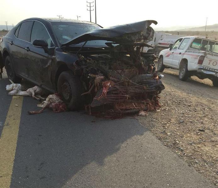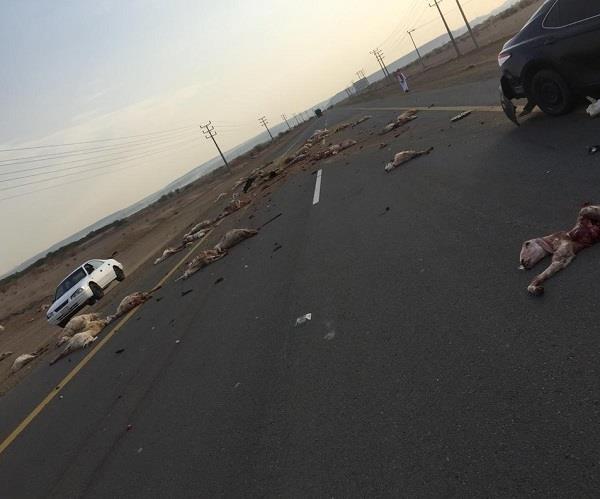 وفقد السائق السيطرة على المركبة بعدما فوجئ أمامه بقطيع الأغنام، حيث اصطدم بها واحدة تلو الأخرى، ما تسبّب في تلف مقدمة مركبته وتعرضه لإصابة بسيطة.