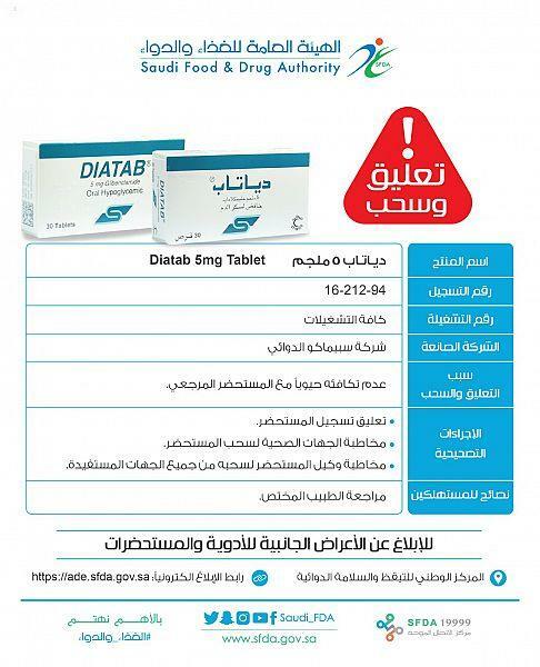 والمستحضران المعنيان هما Glymide 5mg Tablet، المُصنّع من قبل شركة جلفار واسمه العلميGlibenclamide ، والثاني هو Diatab 5mg Tablet، والمُصنّع من شركة سبيماكو الدوائية، ويحمل نفس الاسم العلمي، وذلك لعدم تكافئهما حيوياً مع المستحضر المرجعي.