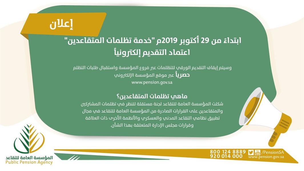 أعلنت المؤسسة العامة للتقاعد اليوم الثلاثاء، عن استقبال تظلمات العملاء حصرياً عبر بوابة المؤسسة الإلكترونية، مع إيقاف استقبال الطلبات الورقية في فروع المؤسسة كافة.