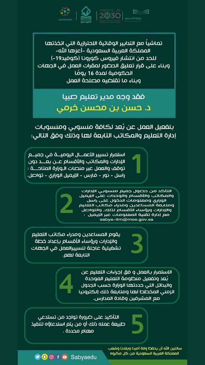 جاء ذلك تماشياً مع التدابير الوقائية الاحترازية التي اتخذتها المملكة العربية السعودية -أعزها الله- للحد من انتشار فيروس كورونا (كوفيد-١٩)؛ وجاء التوجيه أنه بناء على قرار تعليق الحضور لمقرات العمل في الجهات الحكومية لمدة 16 يومًا؛ وبناء ما تقتضيه مصلحة العمل يستمر تسيير الأعمال اليومية في جميع الإدارات والمكاتب والأقسام عن بعد دون توقف والعمل عبر منصات الوزارة المتاحة : راسل – نور – فارس – الإيميل الوزاري – تواصل.