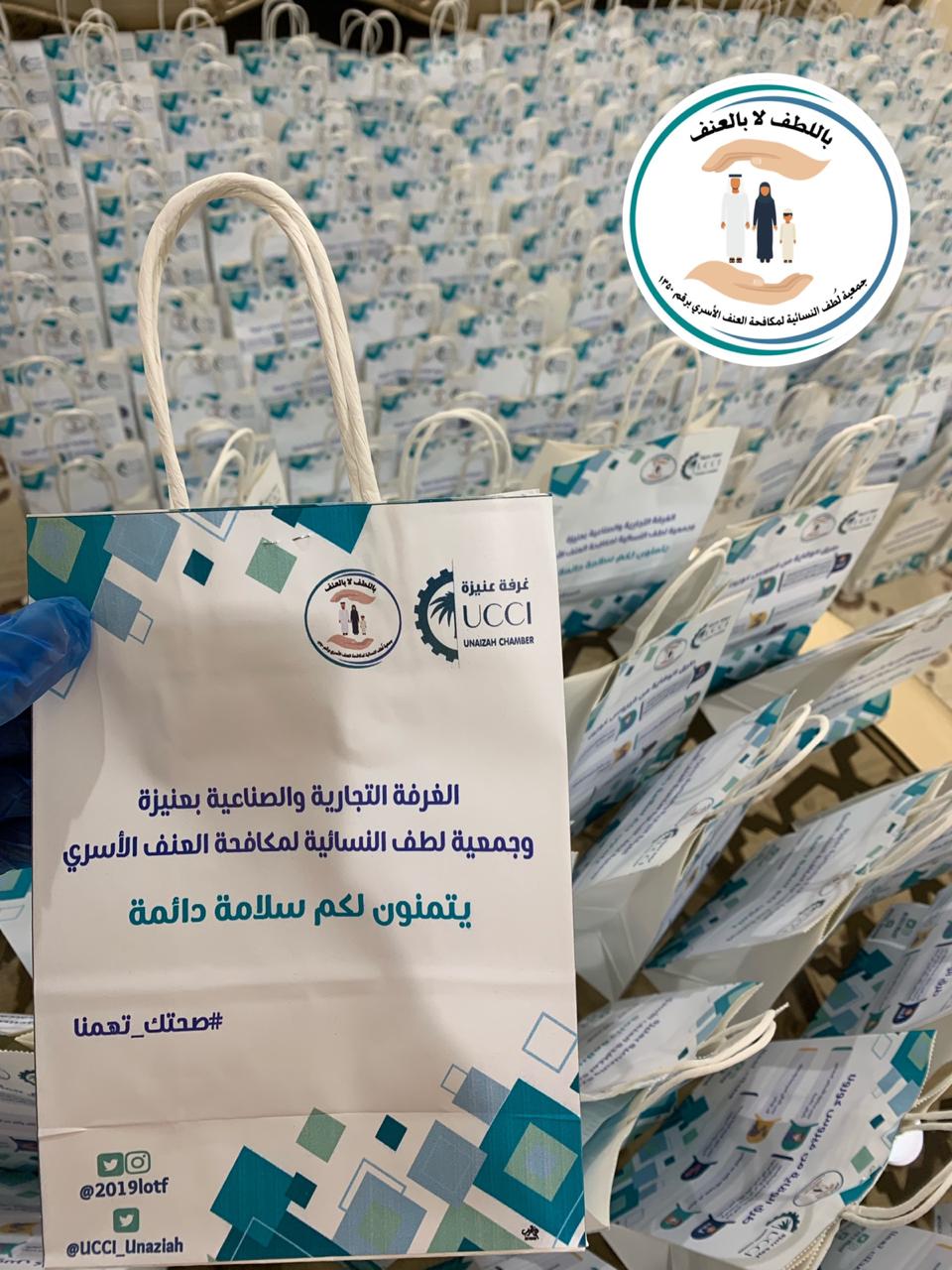 قامت جمعية لطف لمكافحة العنف الأسري بمحافظة عنيزة بمنطقة القصيم،وبالتعاون مع الغرفة التجارية الصناعية بعنيزة، وتحت شعار:”صحتك تهمنا” بحملة اجتماعية ميدانية تتمثل في توزيع أكياس على رجال الأمن العاملين في الميدان بمختلف القطاعات العسكرية كالمرور، والدوريات، وغيرهم من القطاعات الأخرى، ويحتوي الكيس الواحد على: ( سائل تعقيم،كمامة، قفاز).