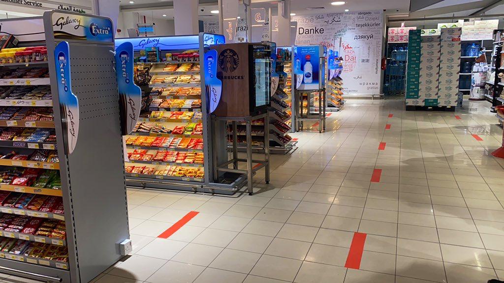 حيث تضمن الإلزام وضع المسافات بين المتسوقين أثناء وقوفهم عند صناديق المحاسبة وعند الرفوف وتكون بمسارات مرسومة على الأرضيات ومخططة بدقة واضحة.
