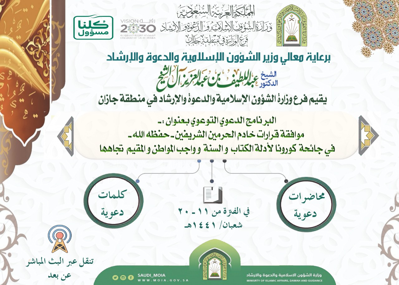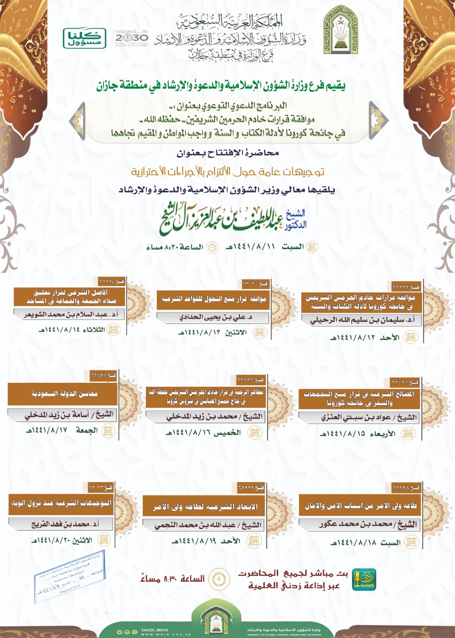 يفتتح معالي وزير الشؤون الإسلامية والدعوة والإرشاد الشيخ الدكتور عبد اللطيف بن عبد العزيز آل الشيخ مساء اليوم السبت البرنامج الدعوي التوعوي حول “موافقة قرارات خادم الحرمين الشريفين في جائحة كورونا لأدلة الكتاب والسنة وواجب المواطن تجاهها” الذي تنظمه الوزارة ممثلة بفرعها في منطقة جازان، ويستمر لتسعة أيام متواصلة بمشاركة عدد من المشايخ والدعاة والمختصين عبر منصات الوزارة الرقمية والإذاعية عن بعد، في إطار البرامج التوعوية والإرشادية التي تواصل تنفيذها مواكبة لجهود الدولة في التصدي لجائحة كورنا.